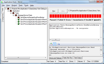 Because you’ll be running your tests so often, it’s best to make sure they’re very fast. If you incorporate mocks or fakes whenever possible, you’ll avoid creating instances of real implementations that might slow things down by accessing the network, connecting to a database, reading files, etc. If you have 500 tests, you don’t want to be waiting around for 5 minutes just to see if a small change had a negative effect—you want your tests to be as agile as you are, so keep them convenient for you and your team by watching for performance bottlenecks and occasionally optimizing for speed as your suite grows larger. Look for long-running tests or fixtures and see if there’s anything you can do to improve performance to make testing easier and faster for everyone. The NUnit test runner has limited timing information available in the GUI.