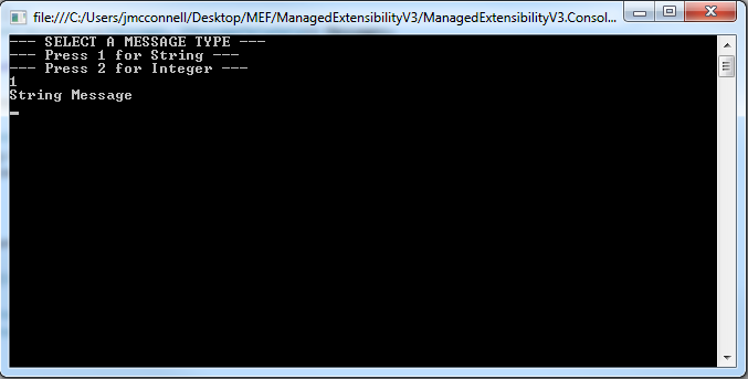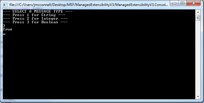 Voila! It picked it up because when the app started up, it looked in the current directory (its own bin directory) and found it because we manually dropped it there. This was really just to simulate how the plug-in aspect works. You could just as easily have read the assembly off disk or from a database at runtime and do your composition then. This truly shows the power of MEF and how it is so much more than just another IoC container.