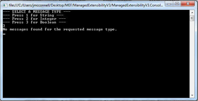 So let’s take a look at what we’re doing. First we’re outputting some instructions to the console and then reading in the user value. Next, we create a new variable to hold the messages that the user wants to see. Then we have a simple switch statement to evaluate the type of message. Just like how Lazy<T> gave us a handy T Value property, Lazy<T, TMetadata> has a handy T Metadata property for us to look at the metadata object. So now we can filter out our requested messages based on the metadata, and only return those messages.