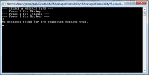 So what we’re doing here is easily explainable. The first line declares an AggregateCatalog, which can hold one or more different catalogs (even other aggregate catalogs, but that’s a bit beyond the scope of what we’re doing). To that catalog we are adding a DirectoryCatalog and telling it to look in the current directory, which is our bin directory. We can do this for this example because we’ve added a project reference to our core library, so we know it will be there. Other catalogs include an AssemblyCatalog, where you provide it the name of an assembly to scan. This is useful if you don’t want to load in every assembly in your project. You can see all the other catalogs by visiting the MSDN site for the System.ComponentModel.Composition.Hosting namespace (link).