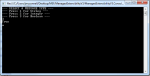 Since our bin directory did not contain our new class library, it didn’t pick up our BooleanMessage class. This is why we put the class in a separate library. Close the console window, open up a new Explorer window and navigate to the bin directory of the new class library project that contains our BooleanMessage. Copy the .dll and paste it into the bin directory of our console app project. Now run the console app again and press 3 for Boolean: