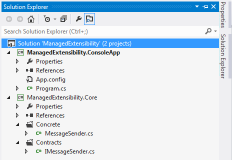 Fire up Visual Studio. Create a new console application ensuring that you are targeting the .NET 4 framework at least (4.5 is fine if you have VS2012 installed). The name I chose was ManagedExtensibility.ConsoleApp. Once you’ve done that, add a reference to System.ComponentModel.Composition. This is located in the global assembly cache, so no need to pull down a Nuget package. Add a new class library to your solution to house your contracts (interfaces) and concrete classes (implementation). I named mine ManagedExtensibility.Core. Be sure to also add a reference to System.ComponentModel.Composition in this project as well. I created two folders named “Contracts” and “Concrete” to my class library. In my Contracts folder, I added a new interface named “IMessageSender” and gave it a single method that returns a string called “SendMessage”. In my “Concrete” folder, I created a new class that implements the IMessageSender interface, and implemented the interface to return “This is a default message.” in the SendMessage method. Your project structure should look similar to Example 1: