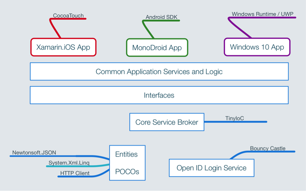 Notice that we coded an app per platform using the Xamarin wrappers provided for that platform. We did not choose to use a cross platform UI solution (i.e. Xamarin Forms). For our purposes we found Xamarin Forms too limiting and unwieldy for our specific application.