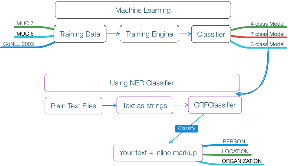 The parts at the bottom of the diagram in the ‘Using NER Classifier’ space (with purple borders) are what you will do in your client code to get person, location, and organization markup placed within your text. Check out the instructions on how to do this in C# / .NET.