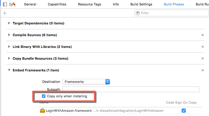 You should see something like the above where the LoginWithAmazon.framework file is in the Embedded Binaries and Linked Frameworks and Libraries section.